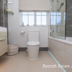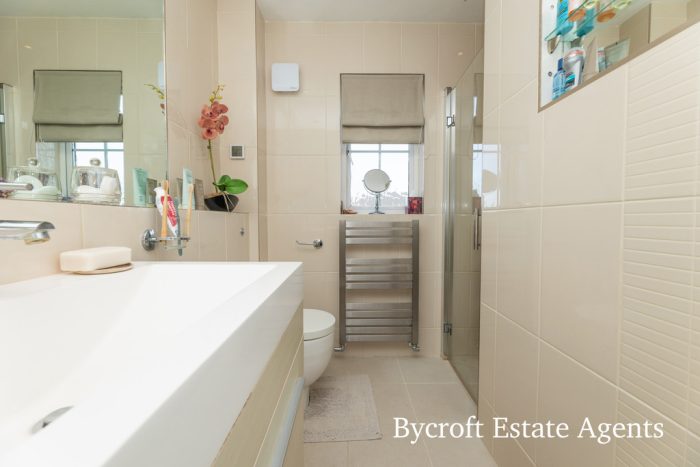 BATHROOM bath with centralised mixer tap, shower screen and mains shower fittings with two showerheads; wc; vanity unit comprising wash hand basin with mixer tap and storage drawer; chrome heated towel rail; tiled walls; recessed mirror; frosted window; downlights.