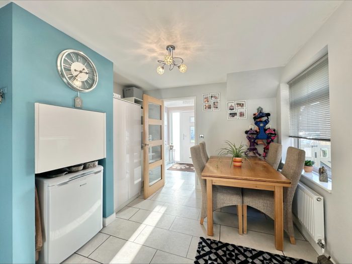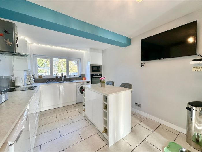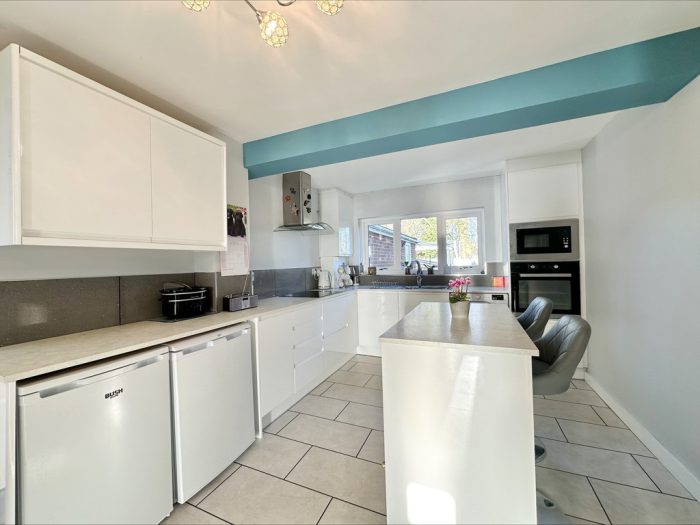 KITCHEN / DINER 20' 8" x 9' 10" max (6.3m x 3m) fitted with a range of wall and base units with square edge worksurface over; tiled splashbacks; built in eye level electric oven with built in microwave over; inset electric hob with cooker hood over; stainless steel one and a half bowl sink with mixer tap; integrated dishwasher; space and plumbing for washing machine; space for undercounter fridge and freezer; island unit with breakfast bar; cupboard housing wall mounted Baxi gas combination boiler; dining area; UPVC double glazed windows to rear and side aspects; UPVC double glazed door to side; radiator.