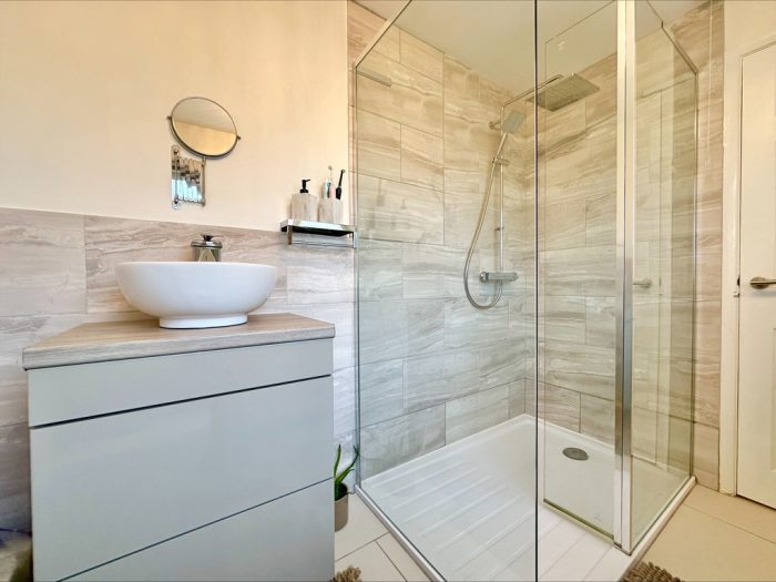 SHOWER ROOM 8' 6" max x 5' 7" max (2.59m x 1.7m) fitted with a white suite comprising of a low level wc; vanity circular bowl wash hand basin with mixer tap and two storage drawers; large walk in shower unit with Mira mains connected shower fittings and two showerheads; tiled splashbacks; UPVC double glazed window to side; radiator.