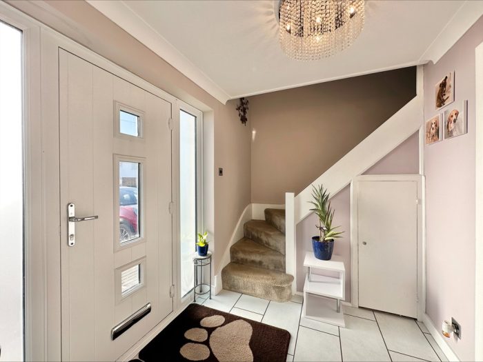 ENTRANCE HALL 6' 11" x 9' 10" max into stairwell (2.11m x 3m) double glazed composite door to front flanked by two full height UPVC double glazed obscure glass windows to front; stairs to first floor; understairs storage cupboard; radiator.