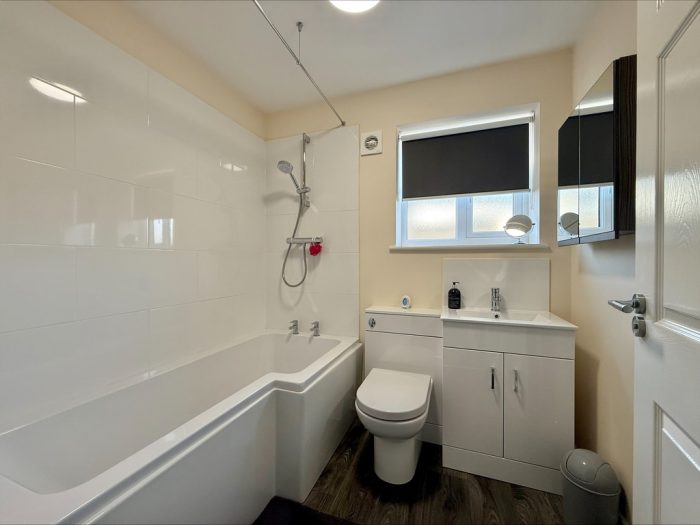 BATHROOM 7' 0" x 6' 1" (2.13m x 1.85m) fitted with a white suite comprising of a vanity wash hand basin with mixer tap and storage cupboard; low level wc; shaped panelled bath with wall mounted shower unit over; tiled splashbacks; extractor fan; UPVC double glazed window to side.
