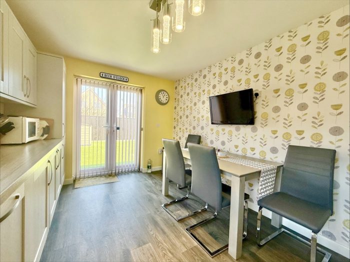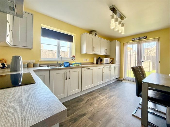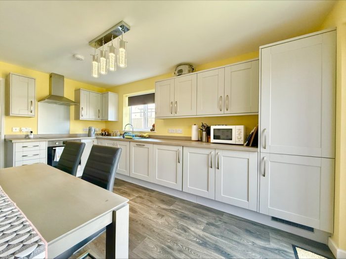 KITCHEN 15' 5" x 9' 8" (4.7m x 2.95m) fitted with a range of wall and base units with square edge worksurfaces over; inset stainless steel one and a half bowl sink with directional mixer tap; integrated dishwasher, washing machine and fridge and freezer; built in electric oven; inset electric hob with cooker hood over; UPVC double glazed window to side; dining area; UPVC double glazed French door to rear.