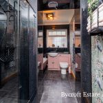BATHROOM shower cubicle with mains fittings and two showerheads; freestanding bath with mixer tap and shower attachment; vanity unit comprising wash hand basin with mixer tap, wc with push button cistern and storage cupboards; further vanity unit with cupboards and open fronted shelving; two chrome heated towel rails; frosted window; extractor fan.