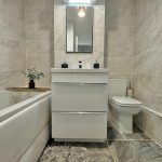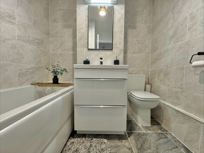 BATHROOM bath with mixer tap and electric wall mounted shower; hand wash basin; wc; heated towel rail.