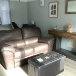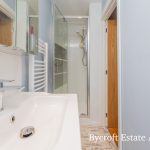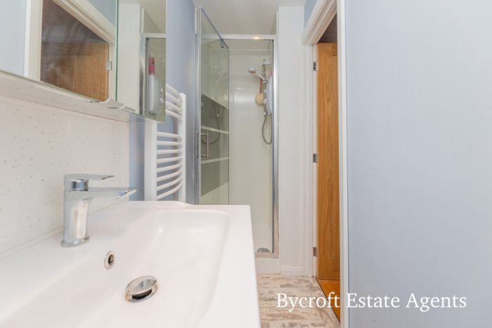 EN SUITE wc; vanity unit comprising wash hand basin with mixer tap and storage drawers; shower cubicle with Mira shower fittings; white heated towel rail; downlights.