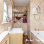 BATHROOM vanity unit comprising wash hand basin with mixer tap and storage cupboard; wc with concealed push button cistern; bath with Mira shower fittings over; radiator; fully tiled walls; frosted window.