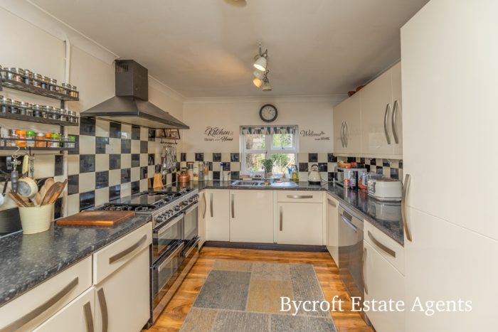 KITCHEN 19' 9" x 9' 3" (6.02m x 2.82m) extensive worktop with a good range of base cupboards and drawers; pull out storage rack; double range oven with double width light and extractor; space and plumbing for dishwasher; space for American style fridge freezer; one and a half bowl sink with mixer tap; front and side windows; radiator; large opening to Conservatory.