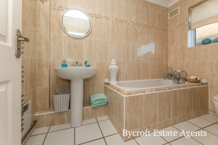 BATHROOM bath with mixer tap and shower attachment; wc; hand wash basin; walk in shower cubicle; heated towel rail; UPVC double glazed window to rear aspect.