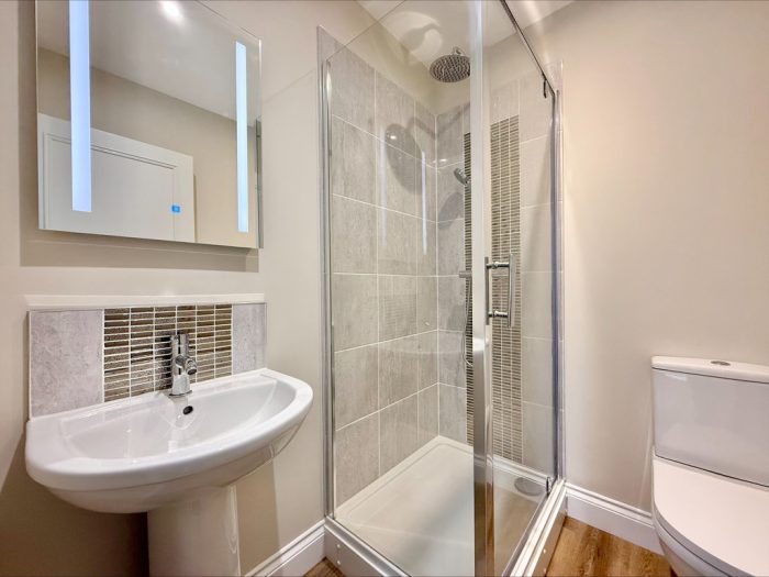 SHOWER ROOM 5' 8" x 4' 10" (1.73m x 1.47m) fitted with a white suite comprising of a pedestal wash hand basin with mixer tap; low level wc; walk in shower cubicle with wall mounted shower unit with hand and soaker attachments; tiled splashbacks; extractor fan; electric mirror; heated towel rail radiator.