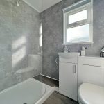 SHOWER ROOM walk in shower cubicle with an electric wall mounted shower; wc; hand wash basin; UPVC double glazed window to rear aspect.