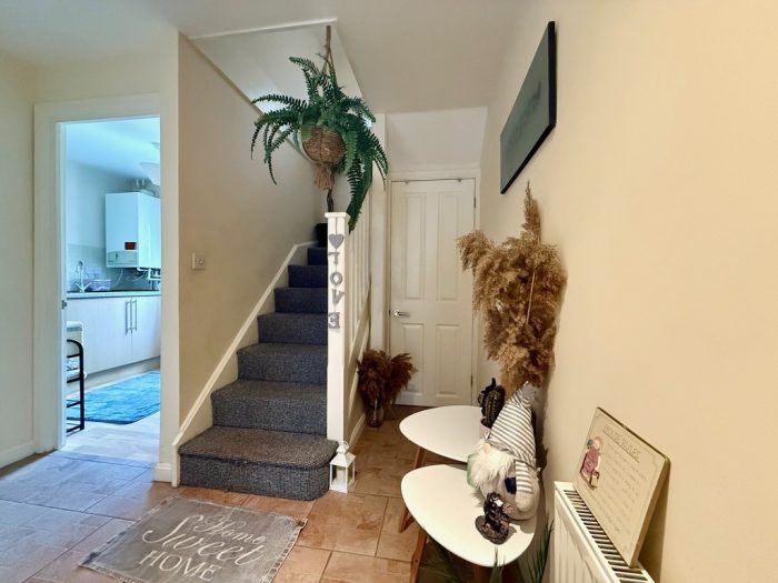 SPACIOUS ENTRANCE HALL entrance door; stairs to first floor; understairs storage cupboard; tiled flooring; radiator.