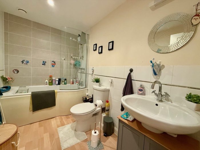 SPACIOUS BATHROOM bath with mixer tap, curved screen and mains shower fittings; wc; pedestal wash hand basin with mixer tap; extractor fan; downlights; radiator.