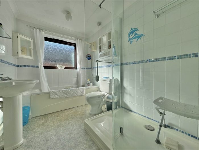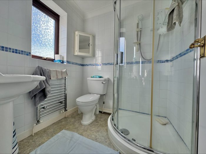 EN SUITE wc; hand wash basin; walk in shower cubicle with an electric wall mounted shower; UPVC double glazed windows to rear aspect; heated towel rail radiator.