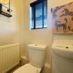 DOWNSTAIRS CLOAKROOM wc; vanity unit with wash hand basin and mixer tap; storage cupboard under; radiator; gas Baxi boiler; frosted double glazed side window; radiator.