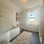 SPACIOUS BATHROOM bath with curved shower screen and Triton electric shower fitting; wc; pedestal wash hand basin; window to rear aspect; radiator; extractor fan.
