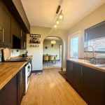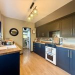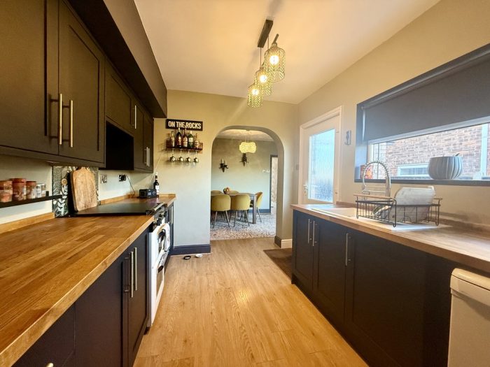 KITCHEN 9' 8" x 8' 5" (2.95m x 2.57m) worktops with a range of base cupboards and drawers under including freestanding oven; one bowl sink; space and plumbing for dishwasher; range of wall units; side window and door.