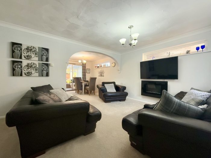 LOUNGE 14' 10" x 12' 1" (4.52m x 3.68m) plus two deep storage cupboards; eco-rad; modern wall hung fireplace; window to front aspect; high level side window; large open archway to Dining Room.