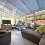 CONSERVATORY 18' 10" x 9' 6" (5.74m x 2.9m) brick base with windows overlooking rear garden; large sliding door to rear; further side door; wall lights.