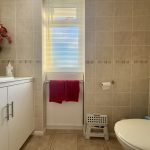CLOAKROOM vanity unit comprising wash hand basin with double storage cupboard under; wc; fully tiled walls and flooring; frosted window.