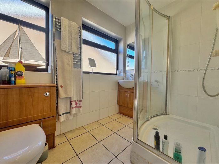 SHOWER ROOM wc; hand wash basin; walk in shower cubicle with wall mounted shower unit; UPVC double glazed window to side aspect; heated towel rail.