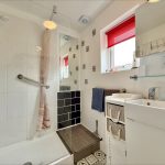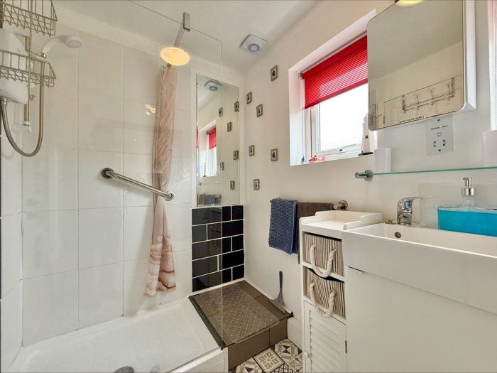 SHOWER ROOM 7' 6" x 5' 2" (2.29m x 1.57m) fitted with a white suite comprising of a vanity wash hand basin with mixer tap; low level wc; walk in shower cubicle with wall mounted electric shower unit; tiled splashbacks; two UPVC double glazed windows to side; extractor fan; heated towel rail radiator.
