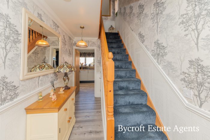 SPACIOUS ENTRANCE HALL entrance door; stairs to first floor; understairs storage cupboard; radiator; side window.