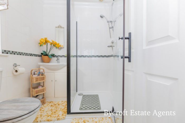 EN SUITE wc; vanity unit comprising wash hand basin with mixer tap and double cupboard under; shower cubicle with mains shower fittings; fully tiled walls; frosted window; chrome heated towel rail; tiled flooring; downlights.