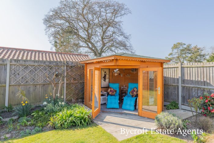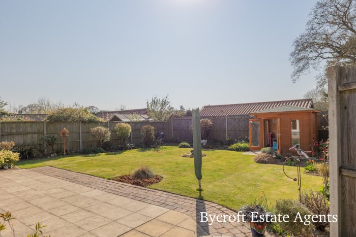 OUTSIDE The property benefits from a corner plot location. To the front there is a driveway providing off road parking for multiple cars, flower beds, garden space and a garage measuring 20' 7" x 9' 2" with UPVC double glazed window to side aspect; UPVC double glazed doors to both side aspects, power, light and an aircon unit. Side access on both sides of the bungalow to the rear. To the rear there is an enclosed garden partly laid to lawn and partly to patio to capture the sun throughout the day with a summerhouse.