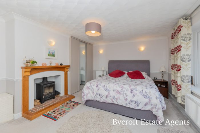 BEDROOM 1 16' 1" x 12' 11" (4.9m x 3.94m) UPVC double glazed bow bay window to front aspect; wood burner; fitted wardrobes.