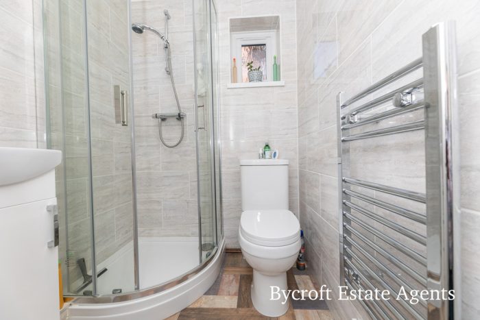 SHOWER ROOM wc; hand wash basin; walk in shower cubicle with wall mounted shower unit; heated towel rail; UPVC double glazed window to side aspect.
