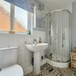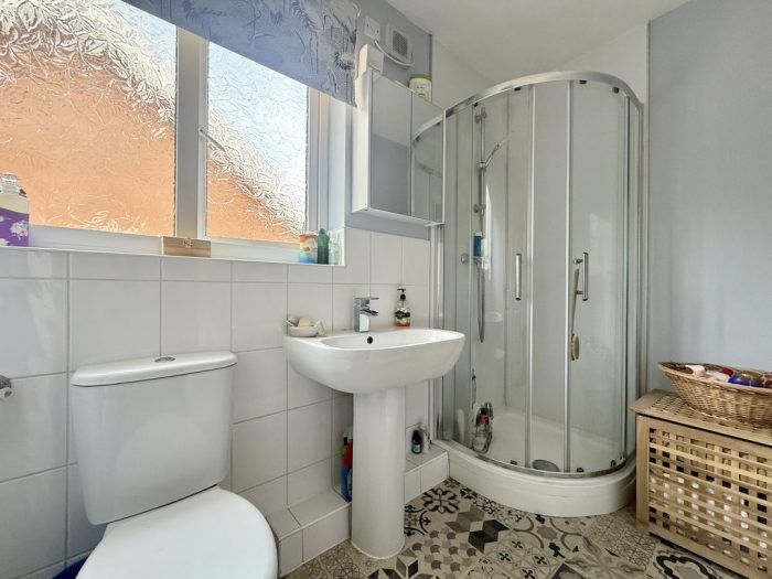 SHOWER ROOM wc; pedestal wash hand basin with mixer tap; shower cubicle with mains fittings; frosted window; chrome heated towel rail.