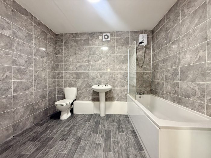 BATHROOM wc; pedestal wash hand basin; bath with mixer tap, screen and Triton electric shower fittings; extractor fan; radiator.
