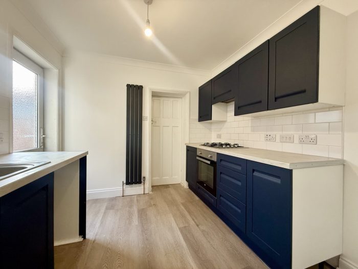 KITCHEN 8' 9" x 8' 10" (2.67m x 2.69m) two worktops with a range of navy base cupboards and drawers; space and plumbing for washing machine and dishwasher; space for upright fridge freezer; built in oven with matching four ring gas hob; one bowl sink with mixer tap; range of wall units; modern upright radiator; side window and door to rear; opening to Utility Room; door to Bathroom.