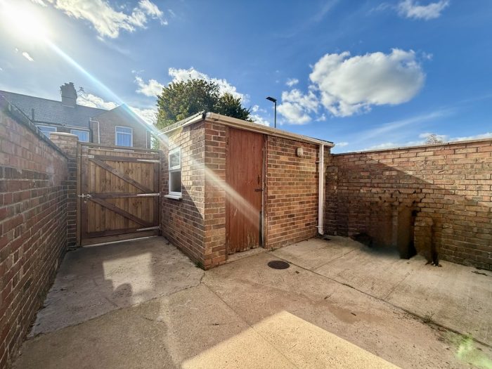 OUTSIDE To the front of the property there is a forecourt area with fencing. To the rear there is low maintenance garden space with brick store/shed and wide pedestrian rear gate providing access.