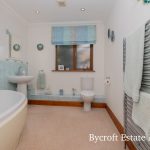 FAMILY BATHROOM corner bath with mixer tap and shower attachment; pedestal wash hand basin with mixer tap; wc; frosted window; downlights; chrome heated towel rail.