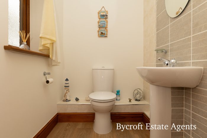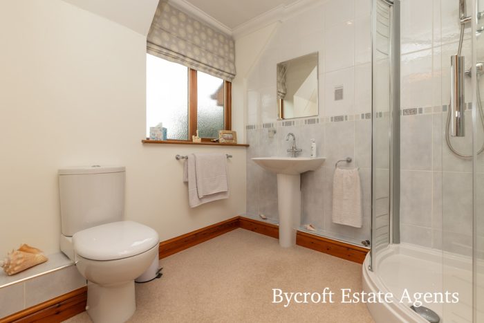 EN SUITE shower cubicle with mains shower fittings; pedestal wash hand basin with mixer tap; wc; frosted window; extractor fan; downlights; chrome heated towel rail.