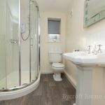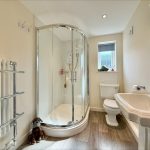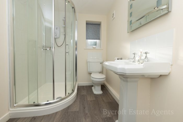 SHOWER ROOM 9' 3" x 5' 10" (2.82m x 1.78m) fitted with a white suite comprising of a low level wc; pedestal wash hand basin with mixer tap; corner quadrant shower cubicle with sliding door and wall mounted electric shower unit; tiled splashbacks; UPVC double glazed window to side; heated towel rail radiator; extractor fan.