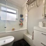 BATHROOM recently fitted bathroom comprising vanity unit with wash hand basin with mixer tap and storage drawers under; wc with concealed push button cistern; bath with mixer tap; mains shower over with two shower heads; frosted double glazed window; modern upright radiator/ towel rail.