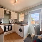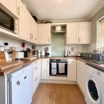 KITCHEN 10' 1" x 7' 9" (3.07m x 2.36m) recently fitted kitchen including u-shaped worktop with range of base cupboards and drawers; built-in Hotpoint oven with four ring hob; space and plumbing for washing machine; space for fridge; resin bowl sink with mixer tap; breakfast bar with radiator under; range of wall units including space for microwave; extractor; window and door to rear garden.