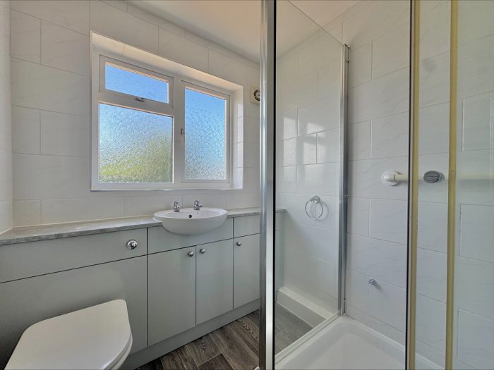 SHOWER ROOM 6' 8" x 5' 10" (2.03m x 1.78m) fitted with a white suite comprising of a low level wc; vanity wash hand basin with mixer tap and storage cupboards; corner quadrant shower cubicle with sliding shower screen door and wall mounted electric shower unit; fully tiled walls; heated towel rail radiator; extractor fan; UPVC double glazed window to rear.