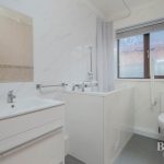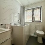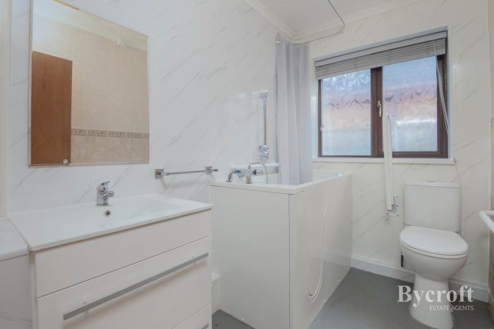 BATHROOM vanity unit comprising wash hand basin with mixer tap and storage drawers; walk in/sit down shower bath with mixer tap and shower attachment; wc; frosted window; storage heater; extractor fan.