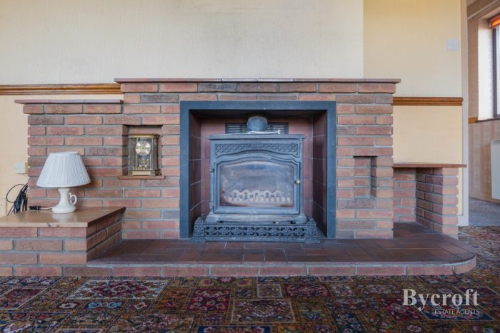 LOUNGE 16' 0" x 18' 5" (4.88m x 5.61m) windows to front and side aspects; feature circular port hole side window; fireplace with raised tiled hearth and cast iron wood burner.