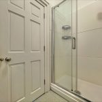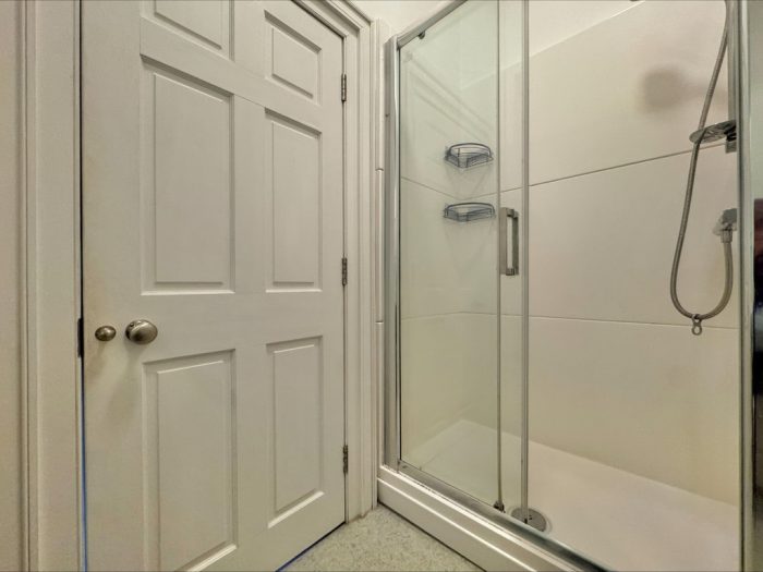 BATHROOM wc; hand wash basin; walk-in shower cubicle with wall mounted shower.