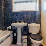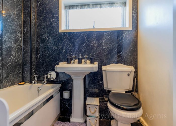 BATHROOM bath with shower unit over; pedestal wash hand basin; wc; heated towel rail; frosted window.
