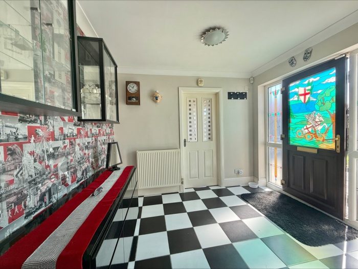 ENTRANCE HALL 21' 9" max x 9' 4" max (6.63m x 2.84m) UPVC stained glass double glazed door to front flanked by two stained glass UPVC double glazed windows to front; tiled flooring; loft access.