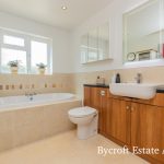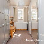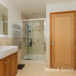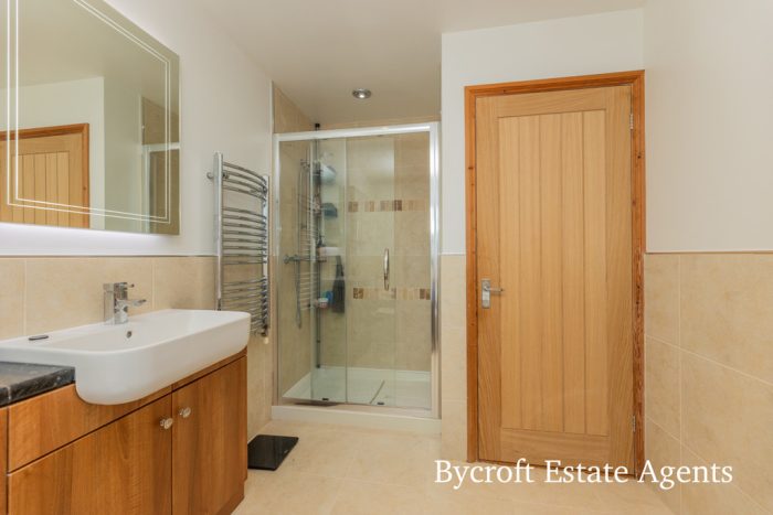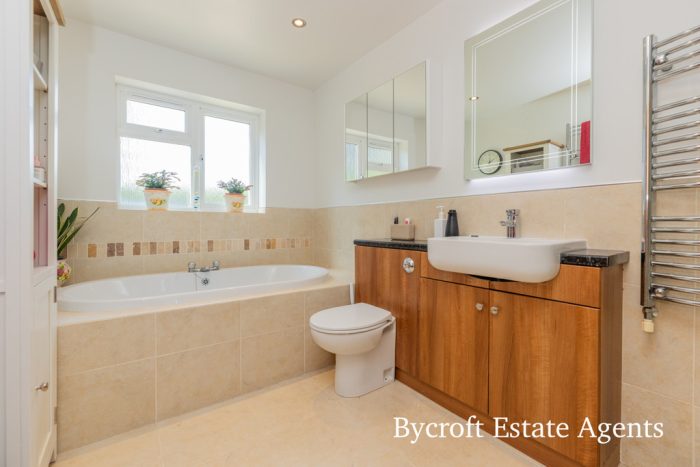 FAMILY BATHROOM 12' 11" max into cubicle x 7' 2" max (3.94m x 2.18m) fitted with a white suite comprising of a sunken double ended bath with mixer tap; low level wc; vanity wash hand basin with mixer tap and storage cupboard; walk in shower cubicle with sliding door and wall mounted shower unit; tiled splashbacks; UPVC double glazed window to front; two heated towel rail radiators.