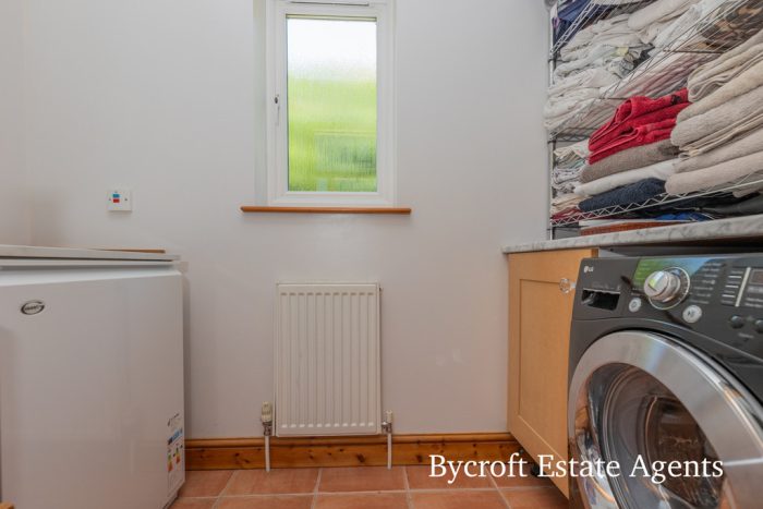 UTILITY / BOILER ROOM 8' 1" x 3' 10" (2.46m x 1.17m) floor mounted oil fired central heating boiler; fitted with a range of base units with roll edge worksurfaces over; plumbing for automatic washing machine; UPVC double glazed window to side; tiled flooring.