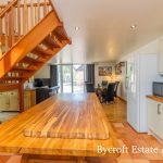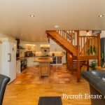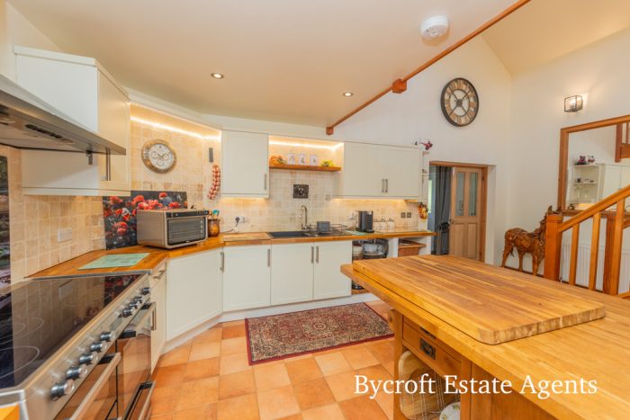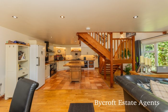 OPEN PLAN KITCHEN / DINING / LIVING SPACE 20' 1" max x 28' 3" max (6.12m x 8.61m) fitted with a range of wall and base units with solid wood worksurfaces over; tiled splashbacks; inset single drainer sink with mixer tap; five ring electric range cooker with cooker hood over; space for fridge freezer; tiled flooring to kitchen area; solid wood flooring to dining and living area; UPVC double glazed French doors to rear flanked by UPVC double glazed windows to rear; UPVC double glazed full height windows to side; stairs to mezzanine level.