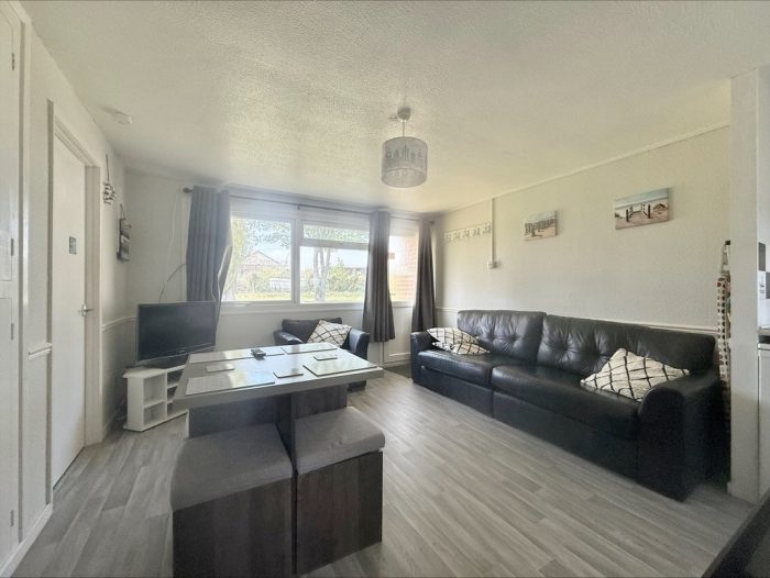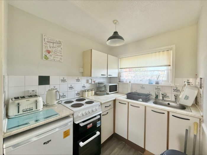 OPEN PLAN LOUNGE / DINING / KITCHEN 18' 5" max x 12' 4" max (5.61m x 3.76m) UPVC double glazed door and window to front; wall mounted electric fire; built in cupboards; kitchen area fitted with a range of wall and base units with roll edge worksurfaces over; inset stainless steel single drainer sink; space for electric cooker; tiled splashbacks; UPVC double glazed window to rear.