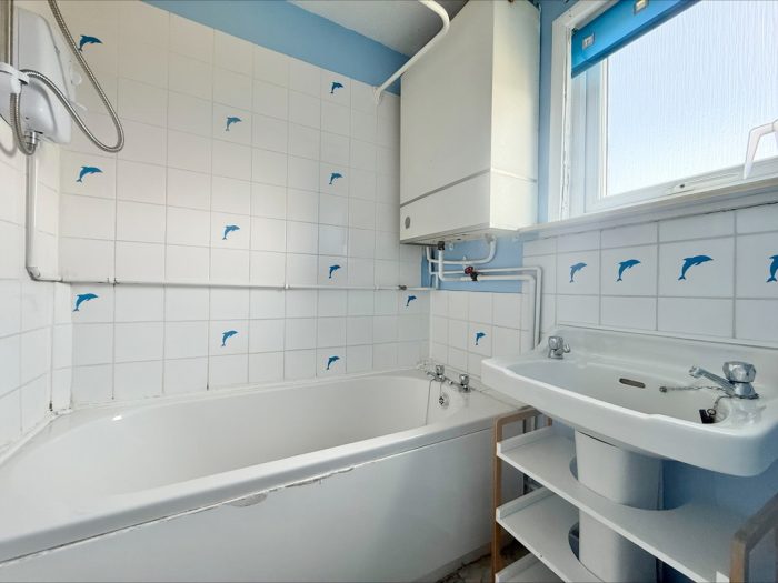 BATHROOM 4' 9" x 5' 2" (1.45m x 1.57m) fitted with a white suite comprising of a pedestal wash hand basin; panelled bath with electric shower unit over; tiled splashbacks; UPVC double glazed window to rear.